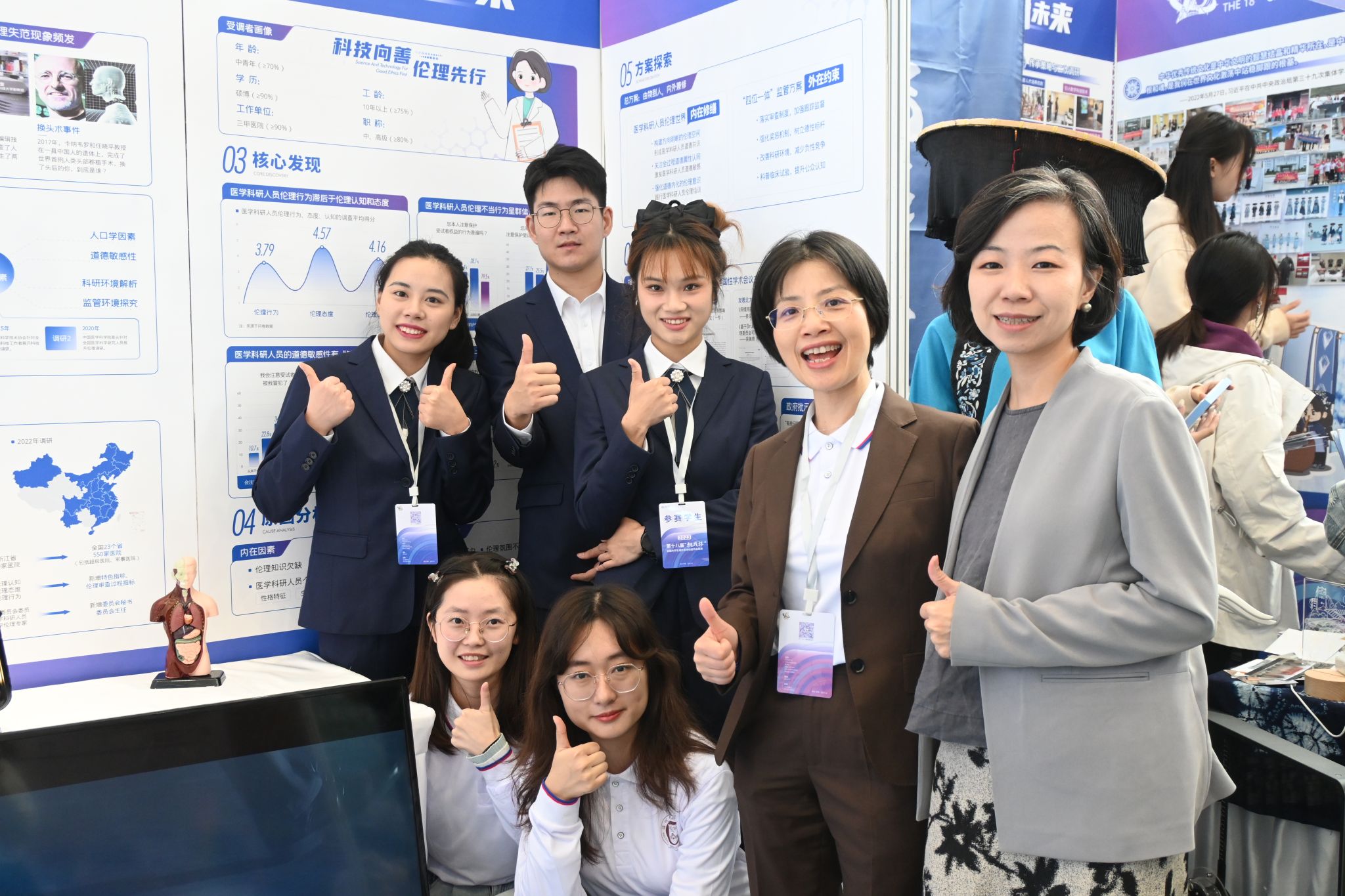 10月30日,由共青团中央、中国科协、教育部、中国社会科学院、全国学联和贵州省人民政府共同主办的第十八届“挑战杯”全国大学生课外学术科技作品竞赛在贵州大学落下帷幕。在本次竞赛中,学校第八次捧回赛事“优胜杯”,共有19件作品获得国家级奖项,获奖数量创历史新高。在主赛道中,获特等奖1项,一等奖1项,二等奖2项,三等奖2项。其中,我院项目《科技向善,伦理先行——医学科研人员伦理知行现状及对策研究》取得了全国二等奖的优秀成绩。