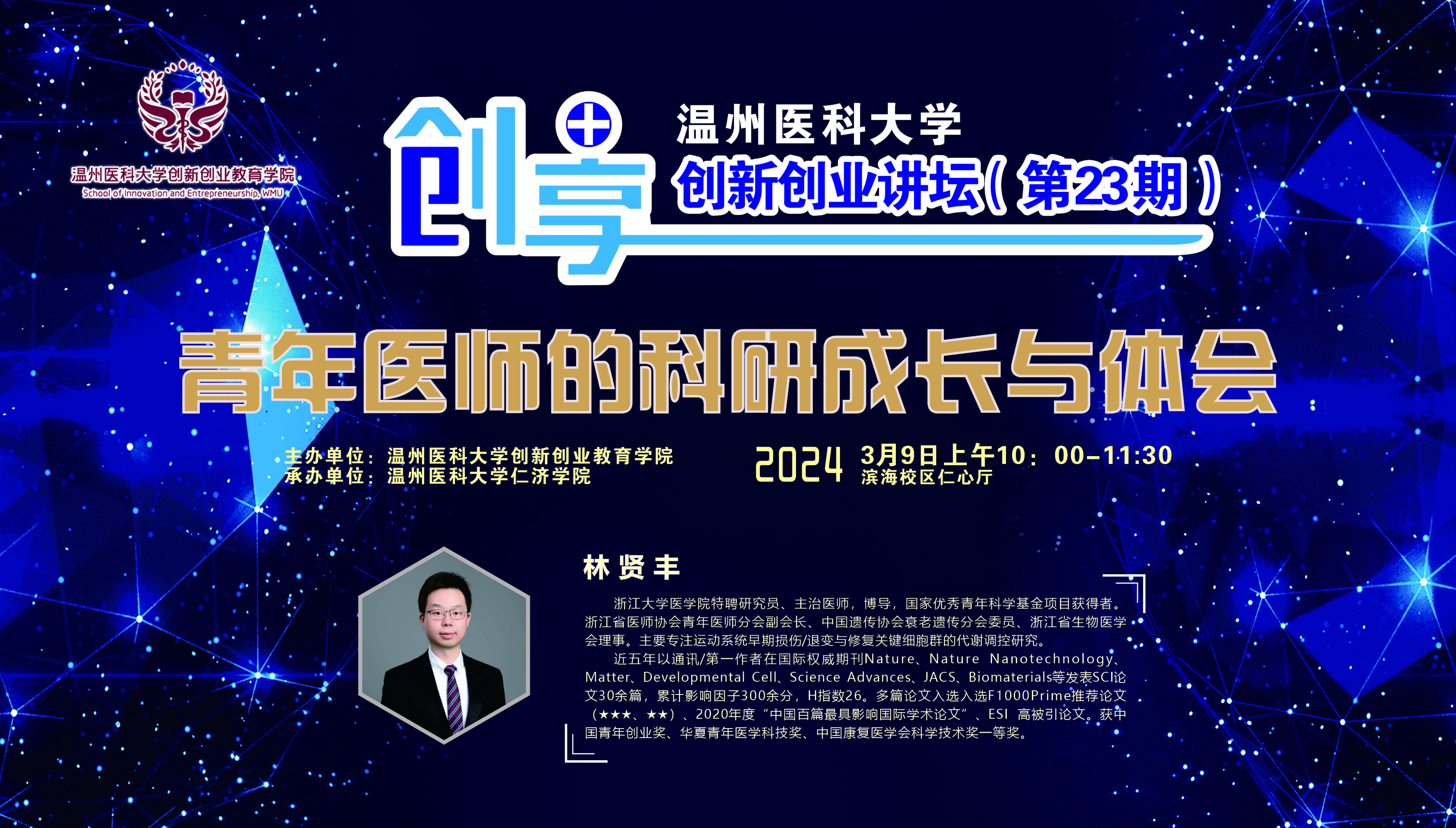 2024年3月9日上午,哔咔漫画 “创享+”创新创业讲坛第23期暨“仁学有约”名家大讲坛第一期在哔咔漫画 滨海校区仁心厅顺利举行。浙江大学医学院附属邵逸夫医院医师、特聘研究员、博士生导师、国家优秀青年科学基金项目获得者林贤丰老师担任主讲嘉宾,为哔咔漫画 学子带来了一场题为“青年医师的科研成长与体会”的讲座。