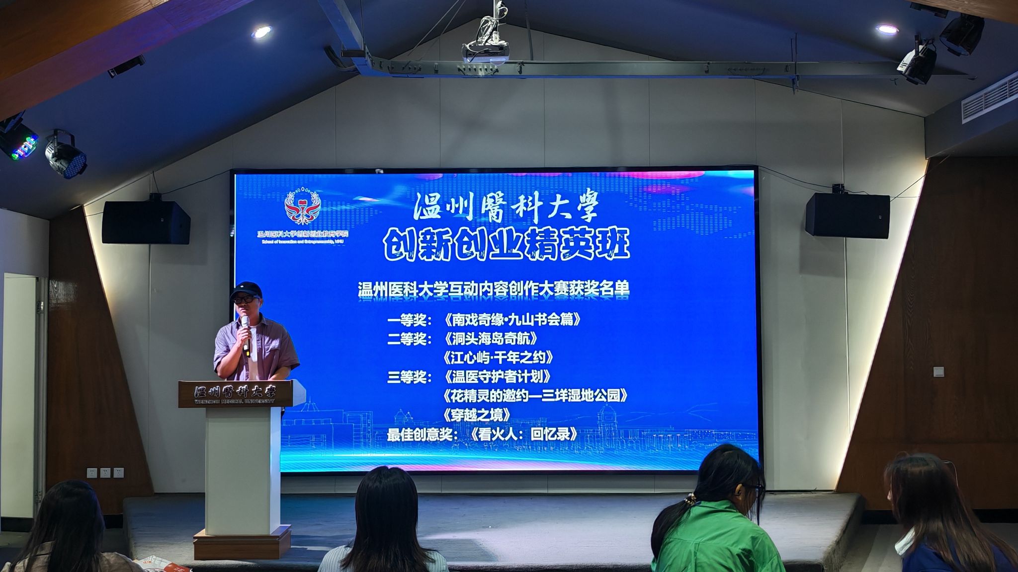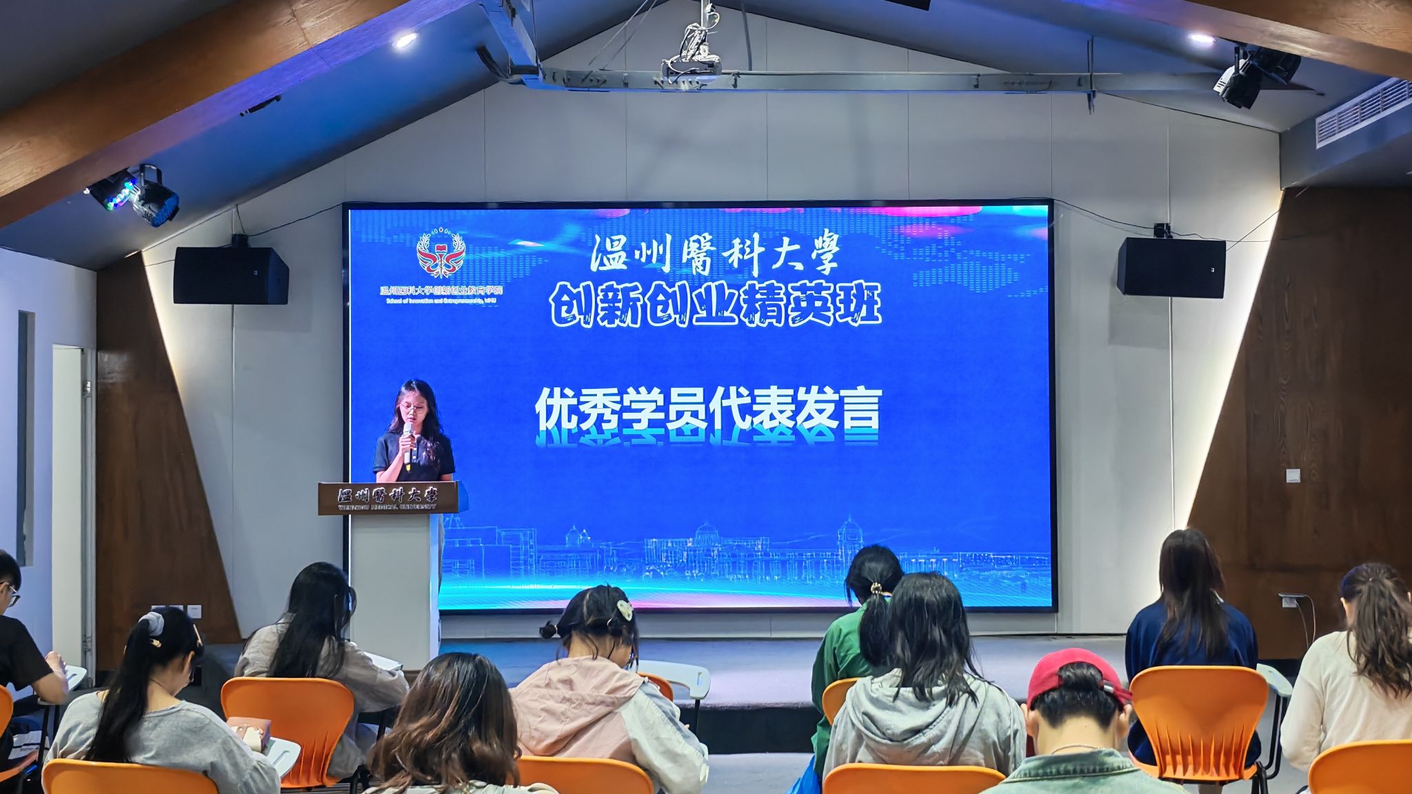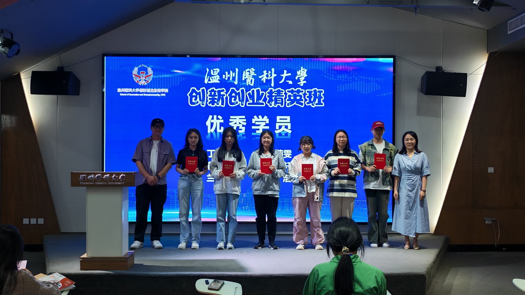 在结业典礼环节,创新创业精英班根据学员在理论学习、小组实践、项目路演等环节的综合表现,评选出 6 名优秀学员并颁发证书。优秀学生代表蒋嘉希上台分享学习感悟:“这段学习经历带给我的不仅是知识图谱的更新,更是思维模式的蜕变。通过各种课程和实践活动,我的思维更加开阔,眼界更加宽广。我学会了用TRIZ将复杂问题模块化拆解,在游戏开发中理解到用户体验的黄金法则,更在团队协作中领悟到‘创新从来不是单打独斗’……未来,我将带着这些珍贵的思维工具,继续在创新的道路上探索前行。”她的发言引发了现场学员的共鸣,掌声此起彼伏。